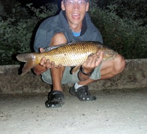 I was pretty impressed at this little character’s courage in attacking a worm almost as long as itself and thought it deserved a picture. After the sun set the carp moved into the shallows to feed and I was able to spot them with the help of a bright headlamp. I hooked up and lost several fish – including one which was almost in my net, before I caught this beauty: