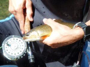 I had been nymphing with an indicator, one of the new Thingamabobbers which have gotten so many rave reviews. I don’t know if the Caney Fork is just heavily fished, but I felt that the indicator was scaring the fish and so I eventually took it off. Anyway, I had some bites and hooked up two fish, one of which threw the hook on a acrobatic leap, while the other simply broke my tippet and swam away. Eventually though, I got my tackle sorted out, pretty much the same rig I use for everything, but with a #20 bead head nymph tied on. I found that the fish were holding in shoals of maybe 10 fish, and so I cast upstream and let my fly drift down through the group. The #20 was too small to see, but I could see the fish chasing it and after a few casts I landed my first fish. My second came shortly after. I let it go without a photo, but Tara took a picture from the bank while I was playing it: