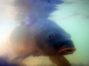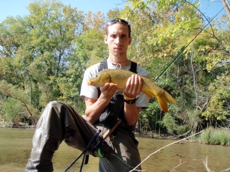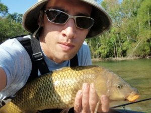 With one fish in my net, and renewed confidence, I struck out again. This time I found what I was really looking for. On a muddy flat which is only accessible by foot when the water is low like it is now, I discovered lots of fish. They were all feeding intently, and they were in super shallow water. This was the “freshwater bonefishing” scenario I had been searching for! Right off I had one good strike, but the hook didn’t set and the fish scattered. A little farther along I spotted a cloud of mud leading towards shore. Looking intently for the fish that made it, a nervous ripple or a tail slicing the surface, I followed the trail. I finally spotted the culprit under some overhanging branches, feeding noisily in water that couldn’t have been more than three inches deep – the entire back of the fish was in the air and shining in the sun. I made two casts which fell short. As the fish turned back towards me I made a third cast, maybe 25 feet, tucking it in under the branches. My fly plopped down right in front of the fish who responded by darting forward greedily. I set the hook and watched with satisfaction as my second carp of the day made waves towards deeper water and my reel buzzed with success.