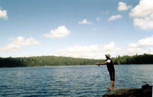 If you ever have a chance to vacation in Ontario, I highly recommend that you visit Algonquin Provincial Park. Most of the park is wilderness – thousands of lakes and low hills shaded by deciduous forest. Tara and I camped by a lake there in the early fall. The park was empty yet, as the hills had not fully bloomed with fall colors, and most of the summer blackflies and mosquitoes had met their ends in the chilly nights. We rented a canoe and paddled all over, spotting birds, beavers, and even a mother moose with a baby in tow. I was uncertain whether there were fish in the lake. The man who delivered the rental canoes to the camp ground had said he had seen people catch lake trout, but never anything else. Indeed, over the first few days I saw almost no signs of fish. I had only a fly rod with me, and I was not equipped to fish deep, where lake trout tend to stay.