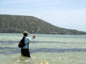 Two seconds after I took the photo, the hook popped out and the fish swam off. Oh, well, that’s bonefishing in Hawaii…