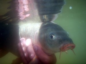 The flood has receded, but the waters remain murky. After a morning of frustrated sight-fishing, I landed a small female carp. She took my fly and headed straight for the trees. Once I coaxed her through the branches and back out into open water, she swam directly at me. At one point she actually bumped into my leg! Despite her best efforts, I got her head into the net, took a few photos and returned her whence she came.