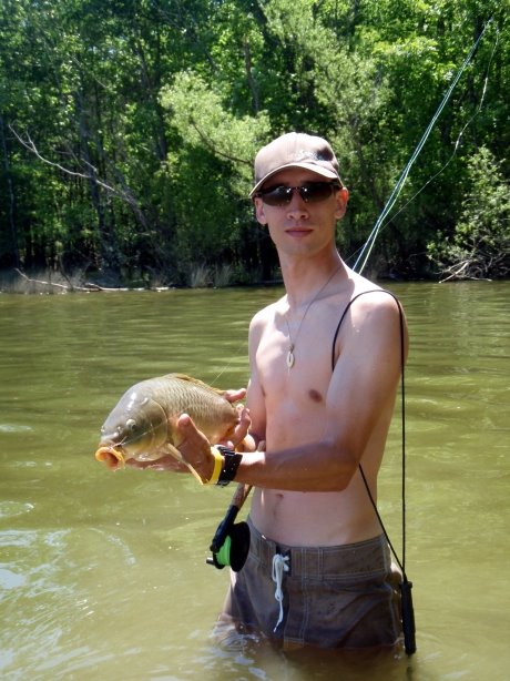 I anchored the boat in the shade and slipped into the water. I hadn’t taken two steps when I saw a big tail moving towards me along the bank. I half hid behind a flooded tree, and as soon as the fish came near I dropped my nymph in the water. The carp immediately turned, inhaled, and the fight was on: