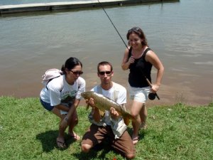 I soon found them and within a few minutes I had Tara, Heather and Michelle chumming with bread while I rigged up my fly rod. I don’t have any bread flies in my collection so I simply took a plain orange nymph and hooked a piece of bread crust on it. My first cast put the bait right in the middle of the feeding fish and in less than a second my indicator was jerked underwater. I only had the fish for a moment, long enough to tell it was pretty big, before my leader snapped. Repeated casts were less successful. The bread quickly became soaked and fell free of the hook. The carp were really keying in on the bread and wouldn’t look twice at my carp bugger. But they were interested in my indicator, a white Thingamabobber about the size of a chunk of bread.