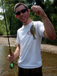 David wasn’t exaggerating when he talked up this spot. Even though it was a Sunday afternoon, we were completely alone and the fish were stacked up in every deep pool and log jam along the stream. The water was full of big hungry bluegills: Brennan tried out fly fishing for the first time and had some luck with the sunfish: