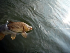 Next I paddled into a small lagoon, the same lagoon where Tara and I had placed our juglines a few days before, and baited 8 jugs with sweet smelling dough-balls. The lagoon lies right between two good flats and I knew that carp often hang out there between meals. Having just landed a fish in one area, I left the jugs and moved on to the second flat. The carp were everywhere! Even though the wind was blowing, the morning sun penetrated the water and I could see orange tails in every direction. After missing a few, I hooked up to a medium sized fish. Some carp don’t run far when they’re hooked but this one took off like a rocket. It paused about 100 feet away, and then swam off in a completely different direction. Unfortunately, my leader had tangled in some algae and the direction change pulled the hook free.