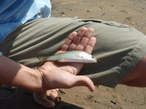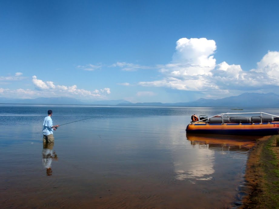 We spent one day touring the tip of the lake by boat. We stopped for lunch at a beach on the end of a long, thin barrier island. Great schools of juvenile omul moved close to shore and, despite their normally zooplanktonivorous nature, I was able to catch quite a few of them on a small red fly.