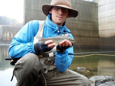 Such an opportunity arose this week. Between snows, the weather warmed to a balmy 44 degrees with a light rain. I headed out, through a snarl of traffic, to the closest tailwater to hunt for some hatchery trout. I was alone on the water, except for a flock of gulls. I worked my way along the bank, watching for signs of fish. Finally, within casting distance of the gray ramparts of the dam I spotted a rise. With all it’s various ducts and chutes closed, the dam produced no current at all, but I rigged up a nymph under a small indicator just as I would for fishing a lively river and made a cast. There was a flash and I found myself hooked to a lively little fish.