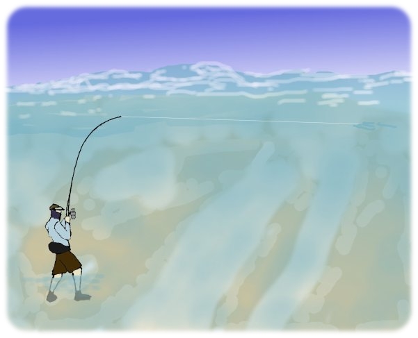Two days ago I headed out on a rising tide. The trade winds had waned to 15 mph and the sunny conditions promised great visibility. Right away I spotted fish, lots of fish. There were big bones feeding alone or in pairs and I saw a shoal of 10 or 15 smaller fish cruising the sand just off the beach.