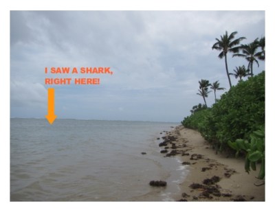I went fishing on the heels of Hurricanes Iselle and Julio, two storms which didn’t seem to affect our neighbourhood even slightly. The water was murky with run-off from rain in the mountains and there was quite a bit of debris washed up on the sand. I spent about an hour casting for bonefish along the flat without a bite, or even seeing any signs of fish. Strolling through the shallows back to shore I caught movement out of the corner of my eye and spotted a black-tipped shark fin in the water. I have spent some quality time with blacktip reef sharks, enough to say with confidence that this was a big fish! The gap between fin and tail definitely put it in the 6 foot plus range. The shark was cruising very slowly away from shore, no more than 40 feet from me. Now, I should probably have gone for my camera but instead I did what any self-respecting flats fisherman would do. I made a cast! I dropped my 3/16 ounce shrimp jig about six feet in front of the shark and gave it a couple of quick jerks but the shark showed absolutely no response and continued placidly into deeper water until it’s fin finally disappeared under the surface.