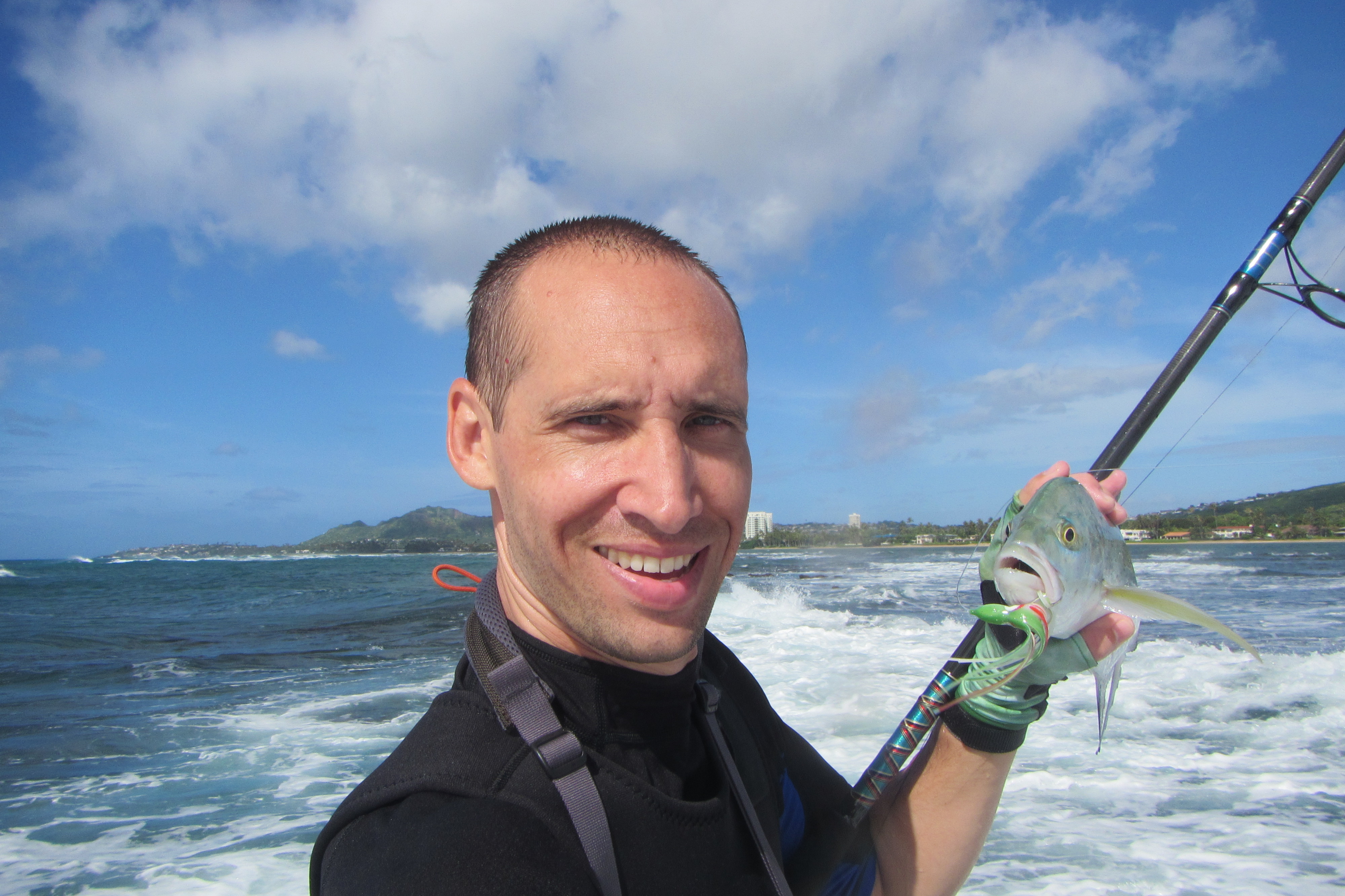 Titan’s Corner is named for the size of the fish I have hooked there. The first time I ever fished the spot I lost all of my tackle to a monster that swam away like it didn’t even know it was hooked. Today I lost my path through the pits and pinnacles of the reef and some how ended up not in the corner but more in the armpit. Balancing on a small, slippery knob surrounded by chest deep water I made a long cast and felt a fish as soon as I cranked the reel. My hook set coincided with a wave that knocked me backwards from my perch. Still fighting the fish I struggled back onto the rock but just as I regained my footing the fish came free. Dripping and slipping I reeled in quickly, intending another long cast to try again for the same fish, but with my lure no more than 20 feet away I had another fish on! I fought to stay on the rock and was rewarded with bites on almost every cast. I hooked six and landed five papio in no more than ten minutes before the action died. None of the fish were big but two of them were big enough to put up a good fight.