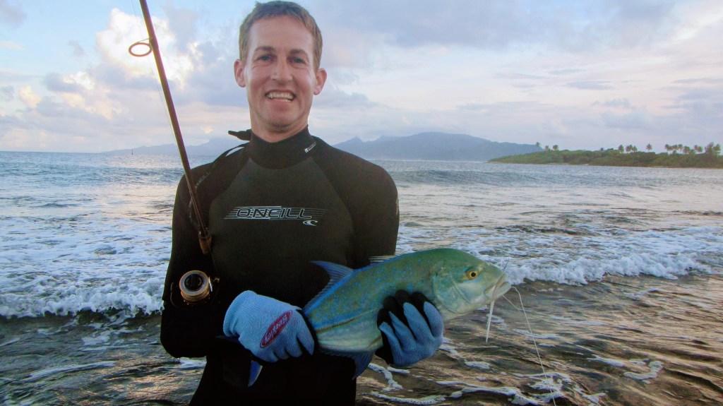On our last evening, Duncan and I fished the edge of a large pass, or channel, in the reef. Since we had only caught small fish from the reef so far, I rigged up the light tackle rods. The surf was up a little bit so were forced to stand pretty far inside the drop off. After getting into the rhythm of the waves and the current, I caught a large trumpet fish. After about 45 minutes the light started to fade and I figured we better pack it in. It seemed good timing because Duncan looked to have gotten snagged on the reef. As I took a second look though, I realized he had hooked into a decent fish. I splashed towards him, trying to yell instructions. The backwash of the surf over the shallow reef edge was strong and I tried to tell him to wait for the next incoming wave to pull the fish in. I also cursed myself briefly for not bringing the bigger rods. Although he doesn’t fish much, Duncan has more ocean-sense in his left foot than most of us will accumulate in a lifetime so, with excellent timing, he deftly reeled the fish in with the next wave. It wasn’t huge, but it was the best trevally of the trip!