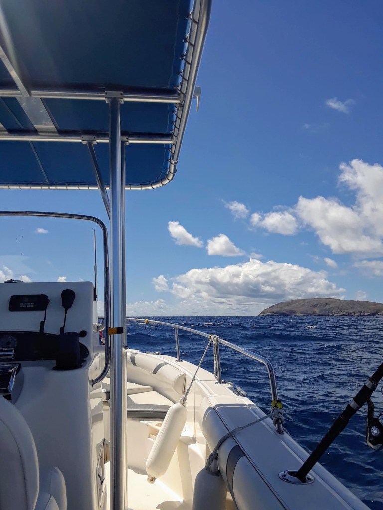 On a recent trip, Makani and I were joined by bonefish guide Ed Tamai and two of Makani’s uncles. We were drifting in about 100 feet of water when we began to see needlefish schooling below us. I noticed that they showed interest in my lures whenever I brought my rig up from the bottom so I started to do that intentionally, dropping my line only about thirty or so feet and then reeling it back up quickly. Sure enough, I started to catch!