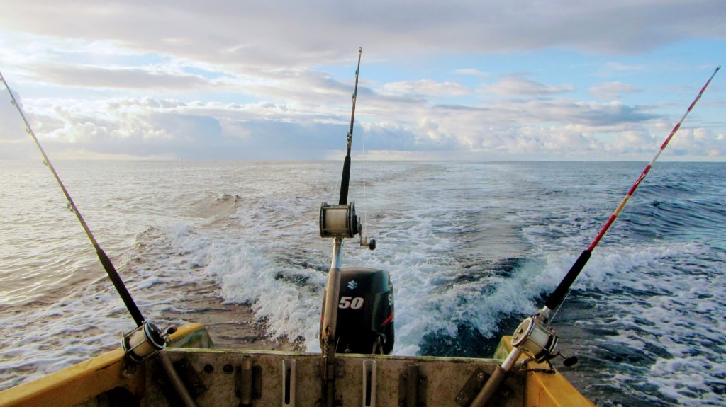 Suddenly there are half a dozen tasks to be done, immediately. The deck must be cleared, lines and lures retrieved, gaffs, nets and gloves prepared, somebody must fight the fish, and another somebody still needs to drive the boat.