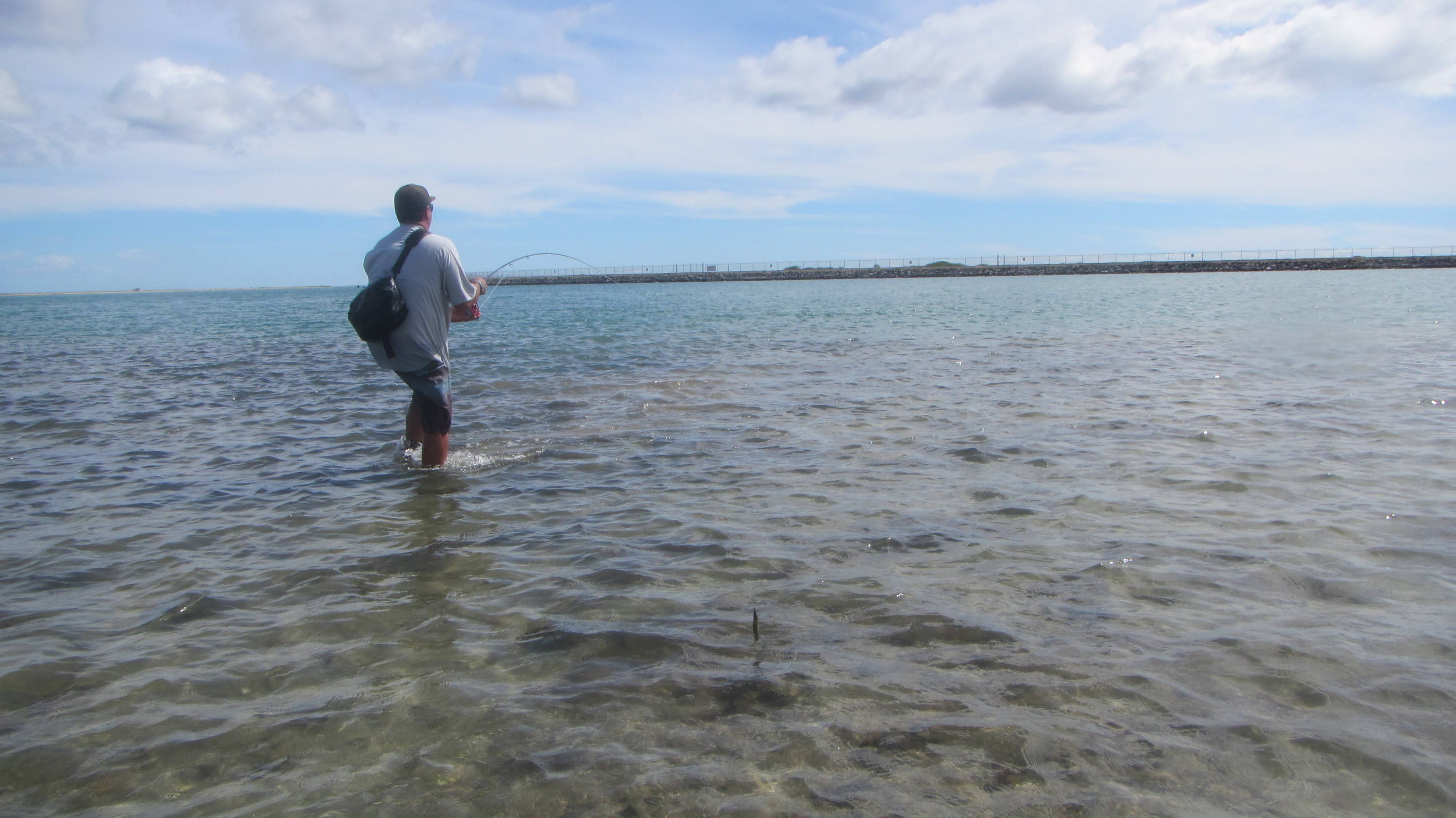 I was just releasing a small bonefish that I found hunting around a patch of weeds when I heard Chris shouting from across the flat. When I saw where he was I knew immediately that he had hooked the elusive golden. After a determined fight, mostly on Chris’s part as he waded almost chest deep to avoid getting snagged on the reef, Chris brought his present in for a few photos.