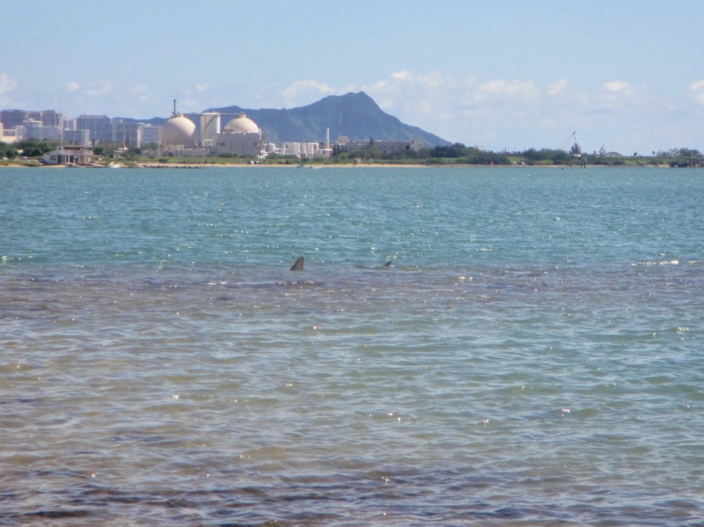 As I freed my hook, I spotted the culprit. A galapagos shark, every bit of seven feet, came cruising by the edge with a purpose. Not wanting to be on the evening news, I tossed the fish head towards it and retreated to the shallows. I snapped a few photos as the shark followed the scent trail to claim the rest of its meal.