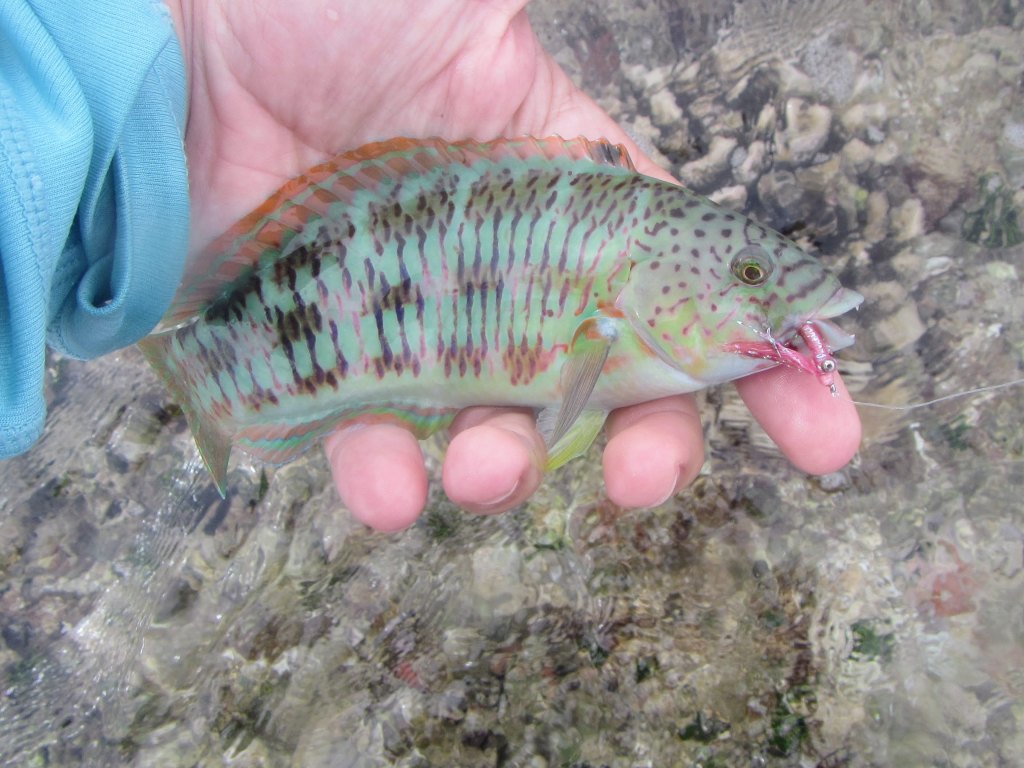 There are other fish in the sea and the surf zone is one of my favorite places to look for them, especially when the clouds roll in and the bonefish are scarce. Large holes or cuts in the reef often hold smaller predatory fish, like wrasses, snappers, hawkfish, and groupers. To catch these fish I usually tie on a very small Crazy Charlie. These predators love to ambush small fish that get caught in the surf, so I usually wait for a small wave and then cast my fly over the spot and quickly strip it back through the foamy, churned-up whitewater.