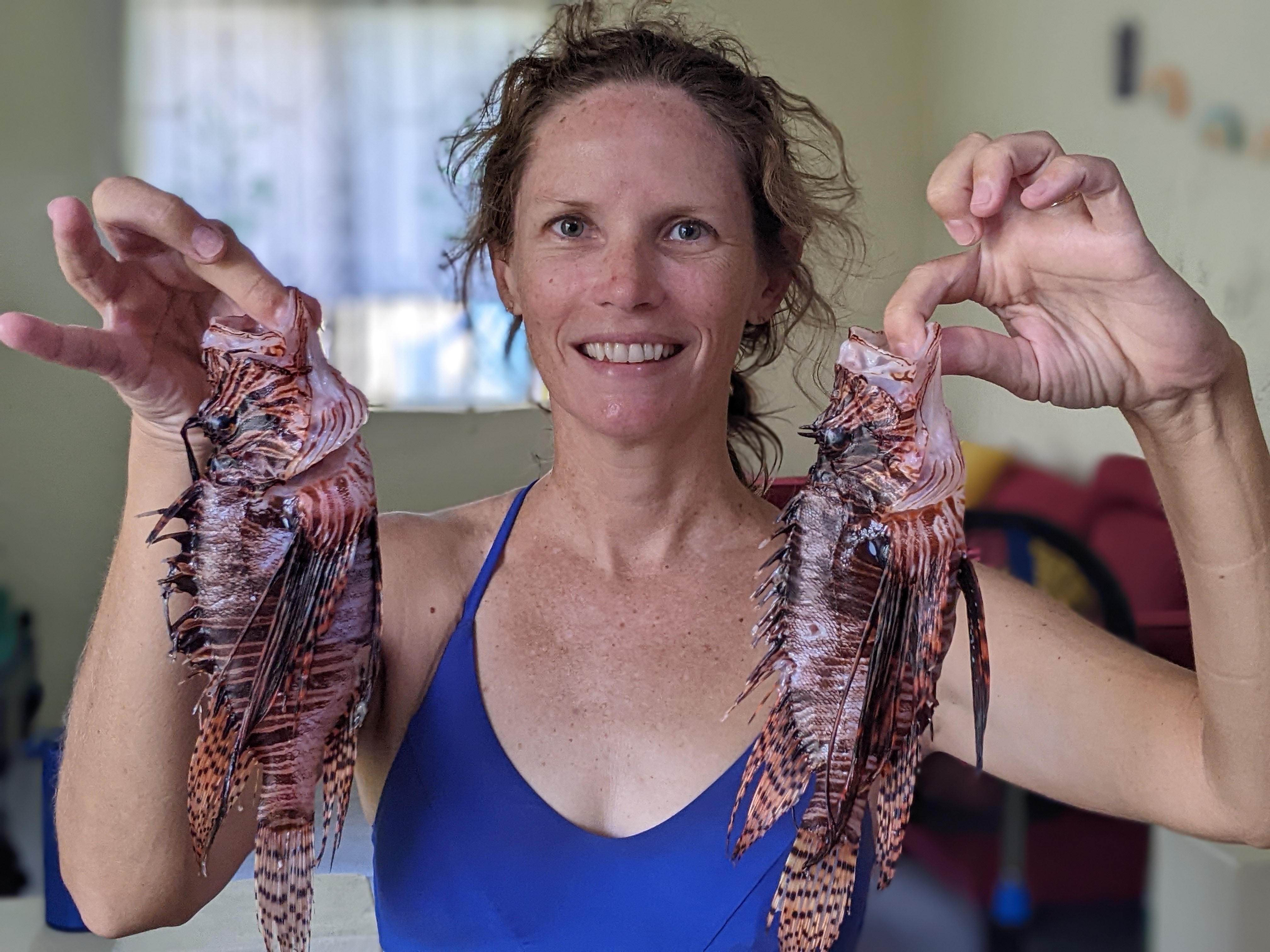 I also speared a few soldierfish, which we gave away to a neighbor, but we had never tasted lionfish before so we kept them for dinner. Lionfish have venomous spines in their dorsal, anal, and pelvic fins, but they can be carefully trimmed off with kitchen shears or scissors. I filleted the fish and cut up some vegetables to make fish broth, a local seafood soup.
