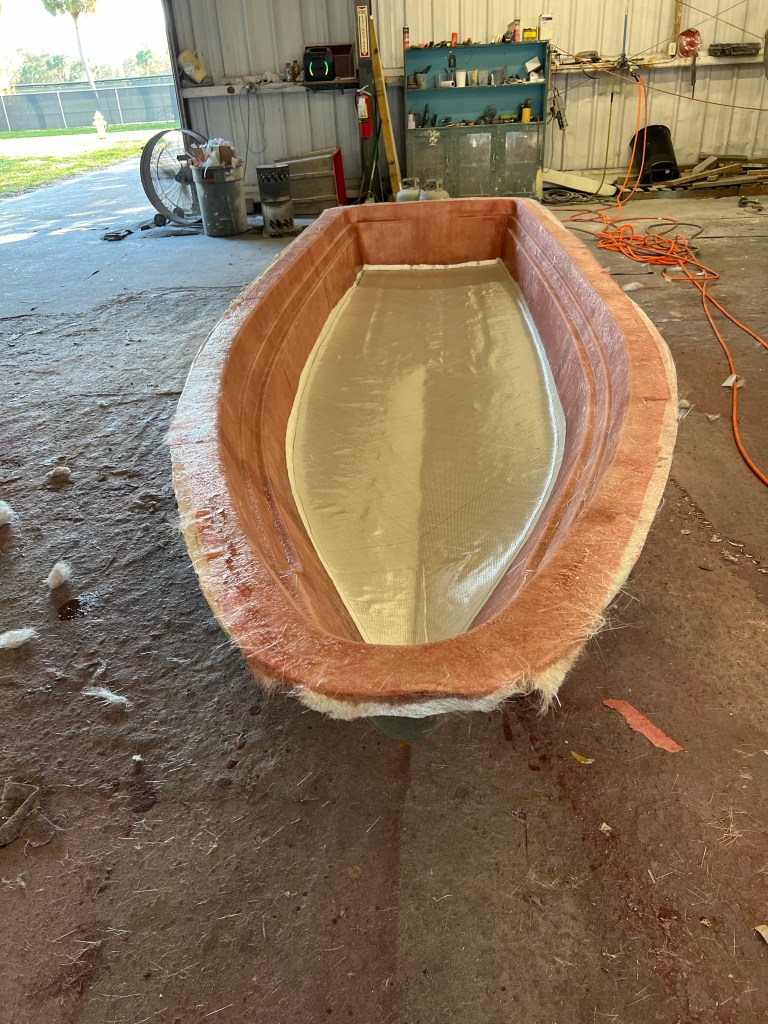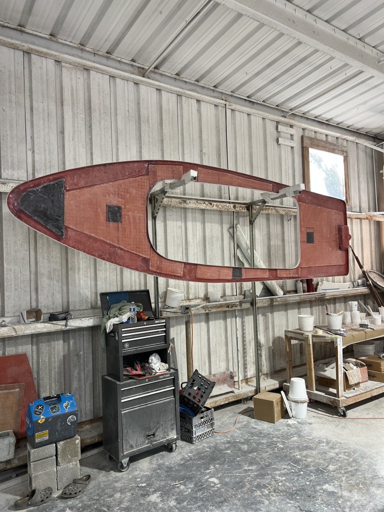 The photos above are other peoples’ Marsh Hens. The second photo is more similar to our build with a trolling motor on the bow and a small center console. Our boat hull has come out of the mold, but the pieces need to be assembled and then she will have to be rigged: