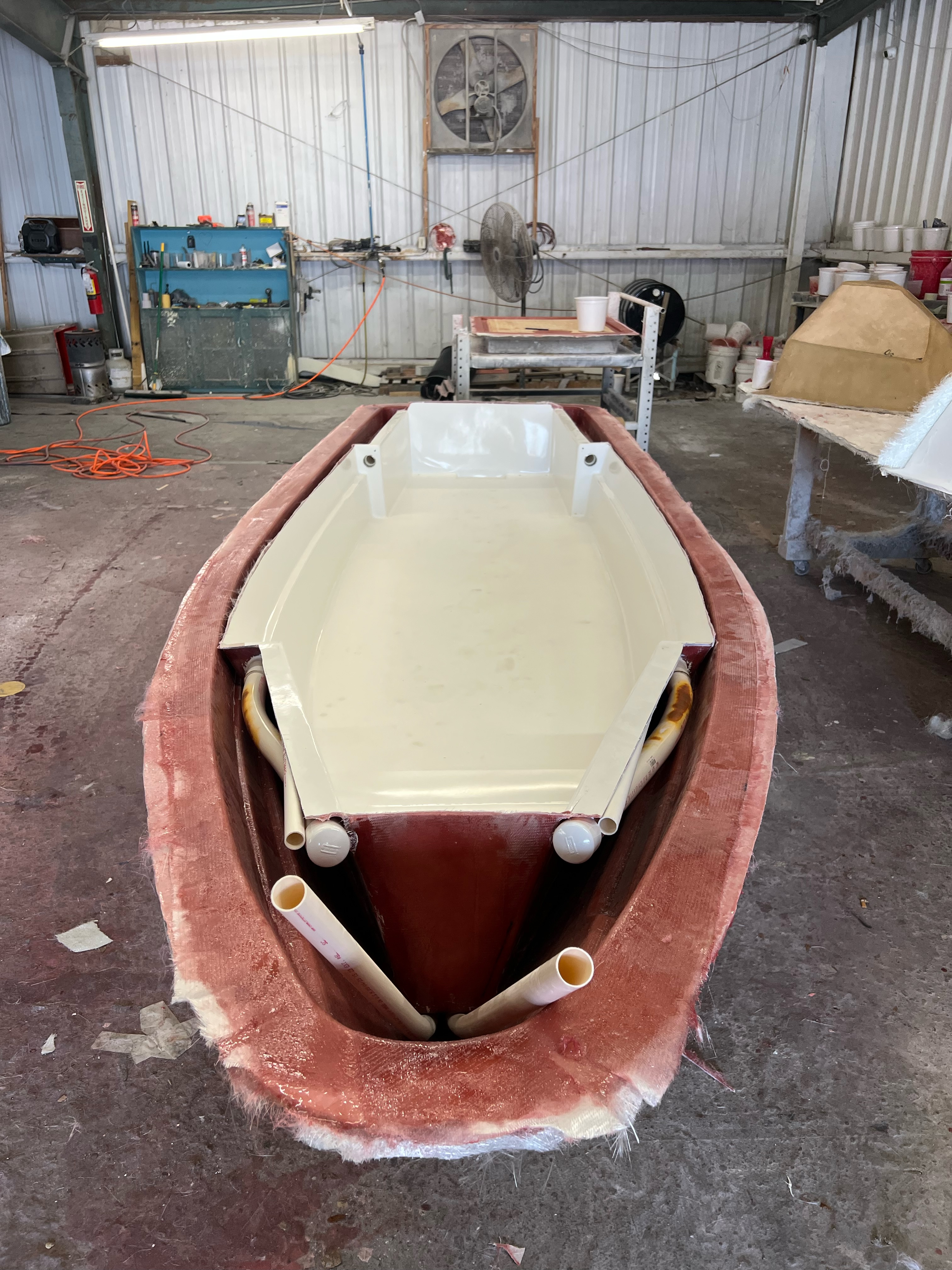 The photos above are other peoples’ Marsh Hens. The second photo is more similar to our build with a trolling motor on the bow and a small center console. Our boat hull has come out of the mold, but the pieces need to be assembled and then she will have to be rigged: