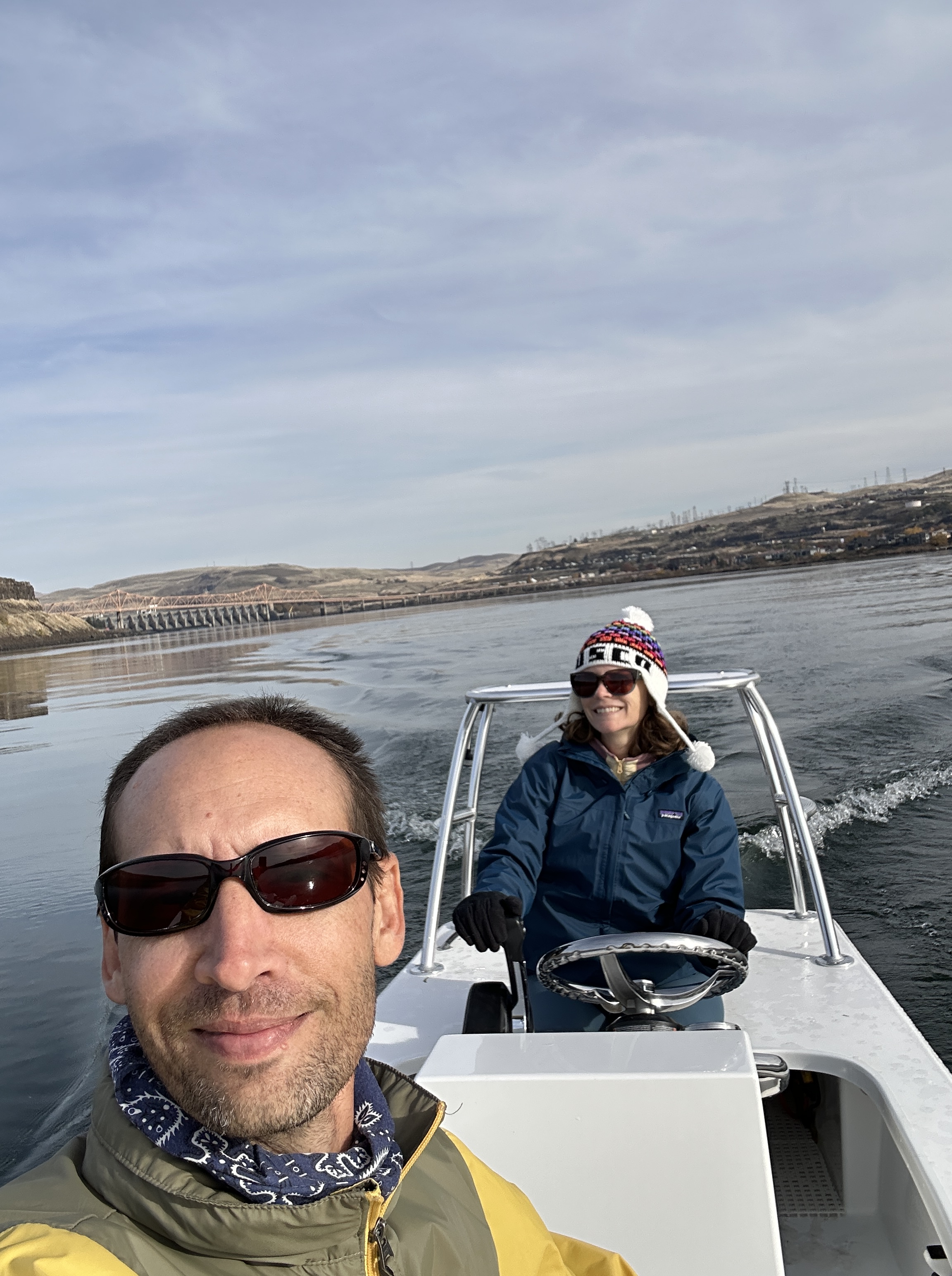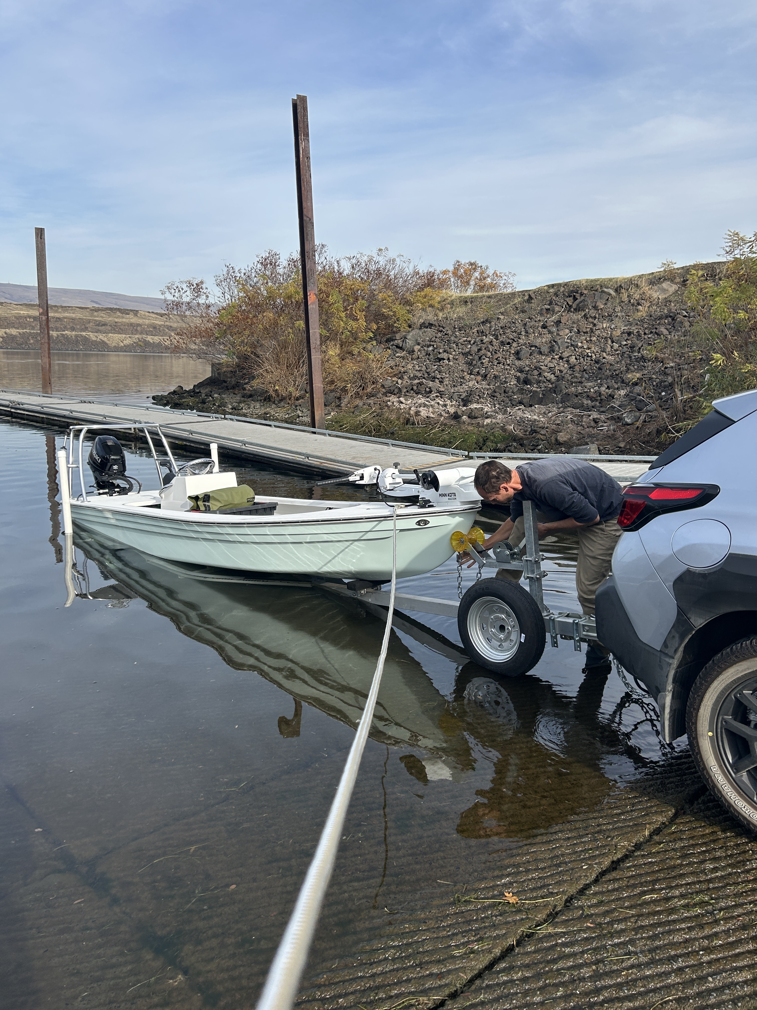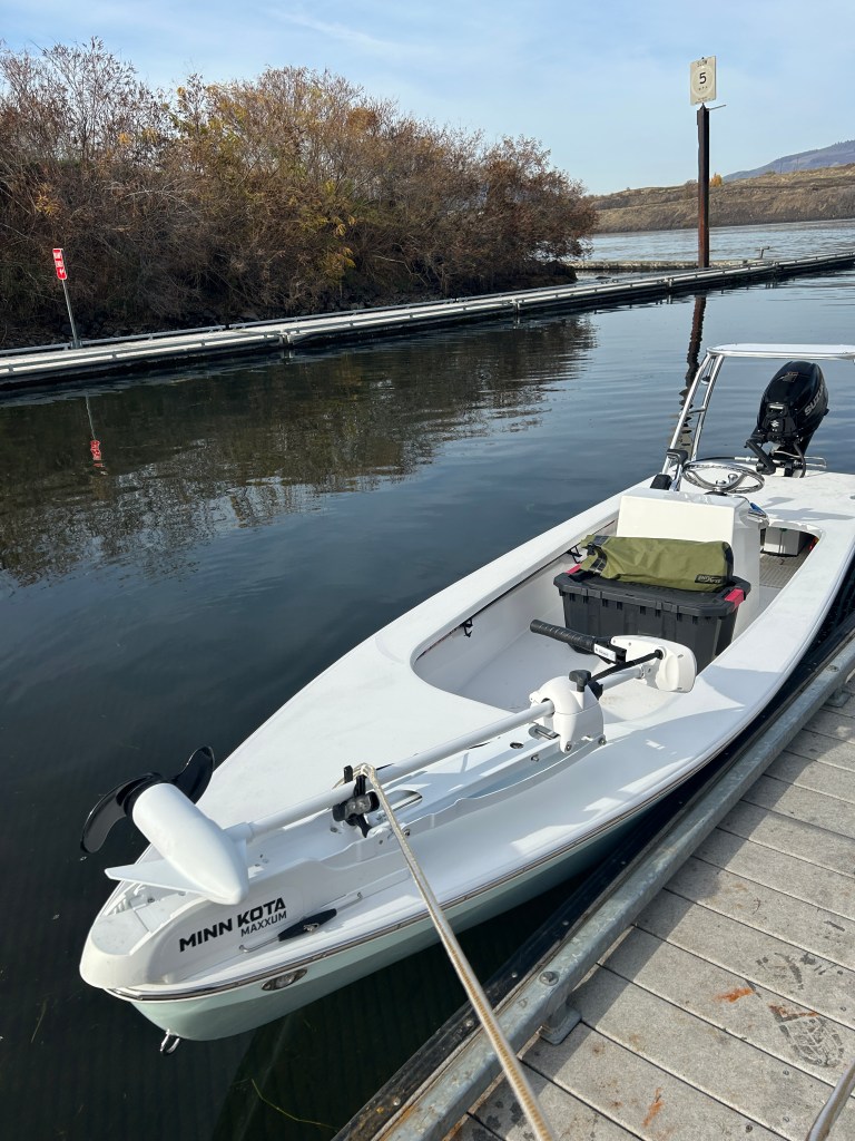 Her maiden voyage was in The Dalles, which was not where I had intended, but the small lake I wanted to try her at was so low the boat ramp was completely dry. The Marsh Hen is 15′ long, 4′ wide, and is usually built with a 9.9hp or 15hp motor, but she arrived with 20hp! I believe that is because the center console and poling platform add some weight. With two people, the 20hp seems perfect, but it’s a bit overkill with just me aboard.
