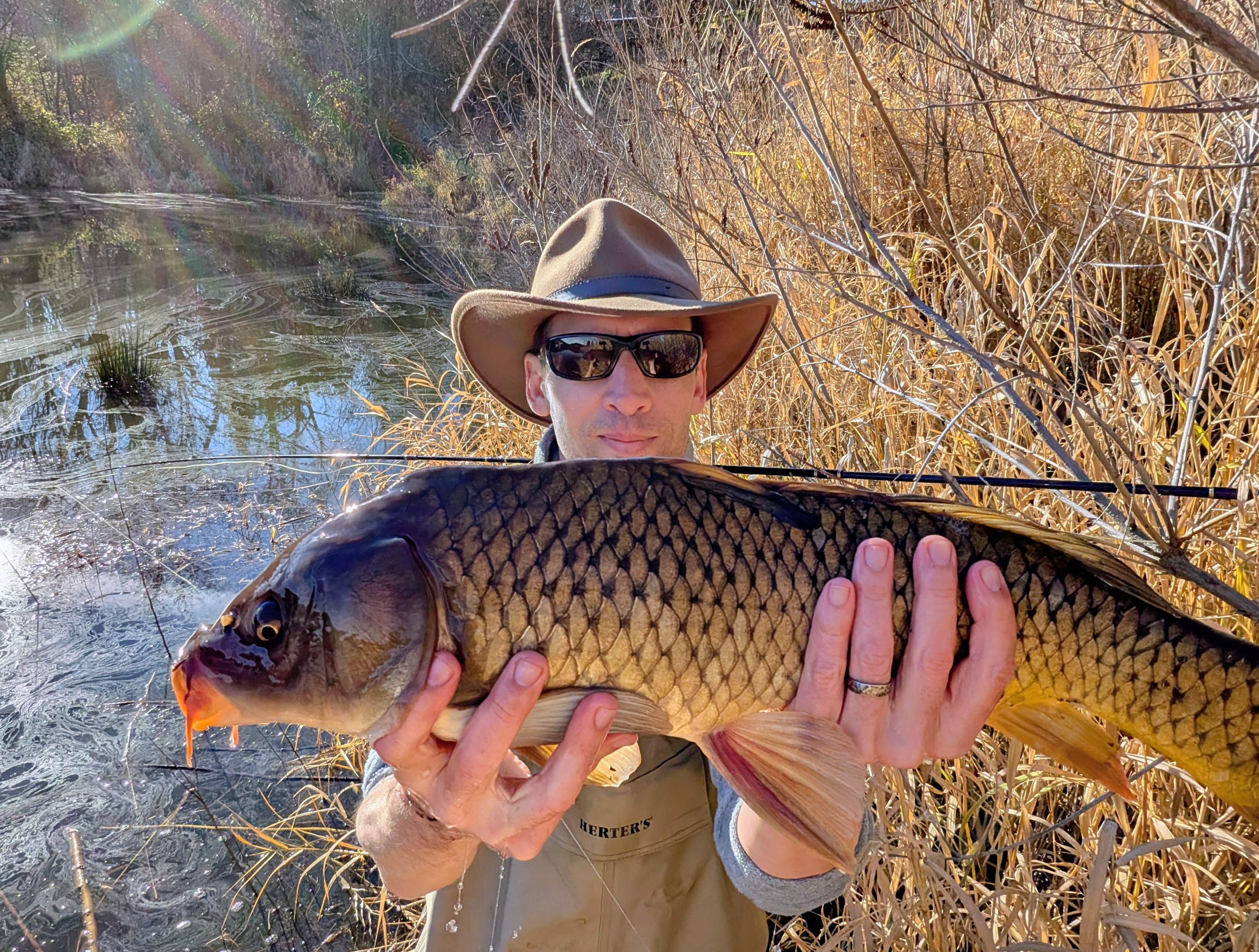 The water was high and turbid and cold. Even at 1 pm I had to break through sheets of ice in the shady shallows. But a little further on, where the sun was shining along the shoreline, I found some carp. They were very lethargic, but a few slowly waving tails told me that they were feeding. I basically had to dap my fly onto their noses to get a response, but I soon hooked my first fish of 2026.