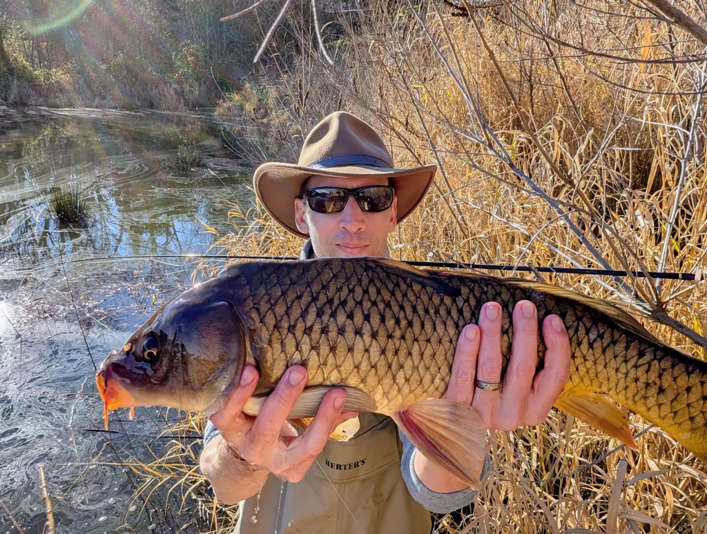 The poor thing didn’t even struggle. It felt like an icicle when I lifted up for a quick photo, but I think the mild air actually warmed it up a degree because it swam away strongly when I set it back into the water. I was also pleased to to check the box of catching a carp on the fly in January.