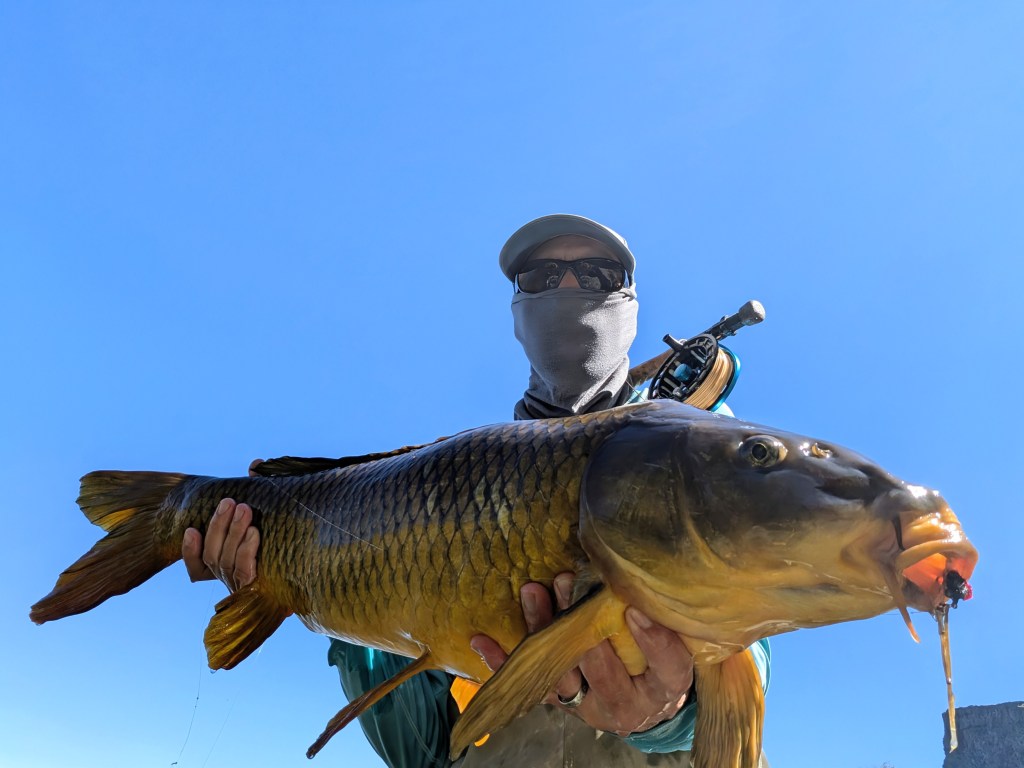 About halfway across the flat I spotted a lone fish, tailing lazily in the sand, the very scenario I had been dreaming about. I had a hybrid fly with a black body tied on (a variation I have been calling the “shadow hybrid” because it sounds cool). The fly had been working extremely well. Two days prior I had landed five fish on it at a small lake, with a bunch more missed fish due to user error. One day before I had hooked five more fish in the river but lost four of them, including a real beast, due to run-of-the-mill bad luck. Needless to say, I was confident in my fly, so I was confused when the fish had zero reaction to my offering. Often, moving a fly from in front of a fish, to recast it for example, will spook a carp, but I tried it anyway. The carp didn’t react to the disturbance, and continued to ignore the fly when I made a second cast. It was facing me at an angle so I was dropping the fly on the near side of the fish to avoid placing the leader over the fish’s head. I made a third cast, dropping the hybrid a bit farther away and more in front of the fish. Then I just left it there and waited. The carp turned slowly towards me, munching its way along the bottom, and then paused and turned back to tail right on my fly. I set the hook, and the fight was on.